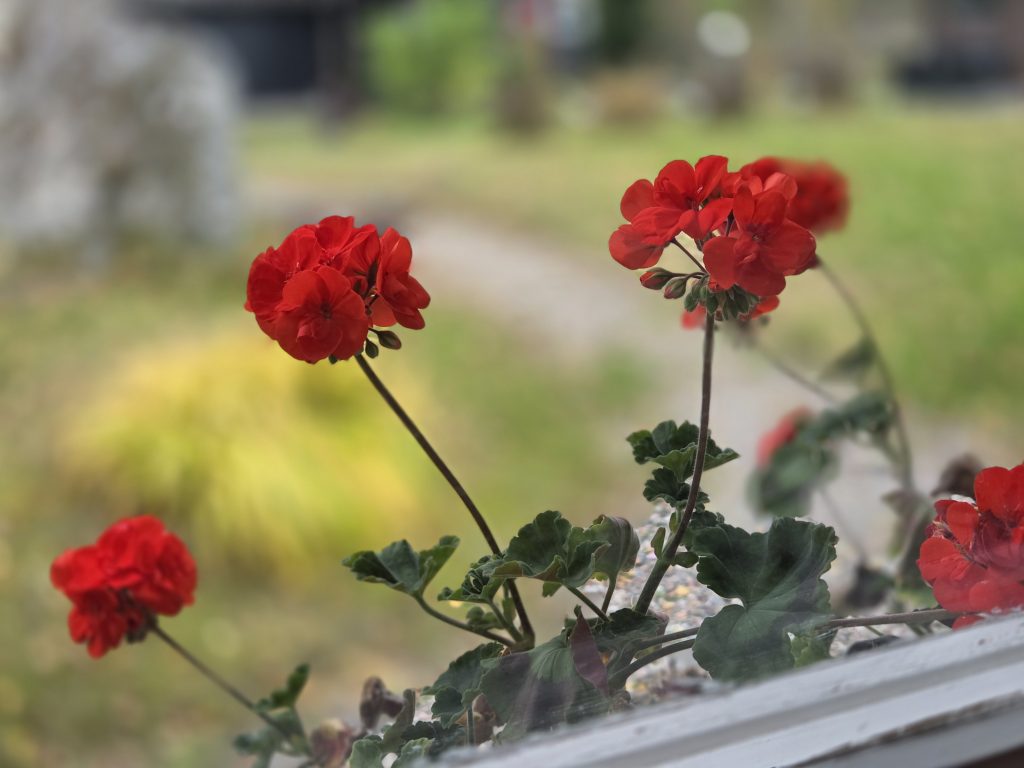 De här pelargonerna ska plockas in till nästa helg då landet stängs av för vintern. Men än så länge får de vara i blickfånget från köksfönstret.