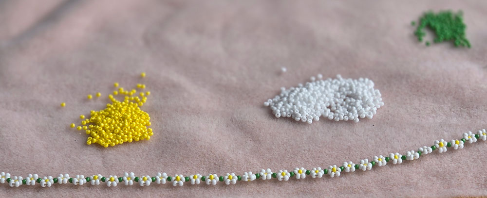 Halsbandet är gjord av glaspärlor och sydd med en mycket tunn nål och stark tråd.
