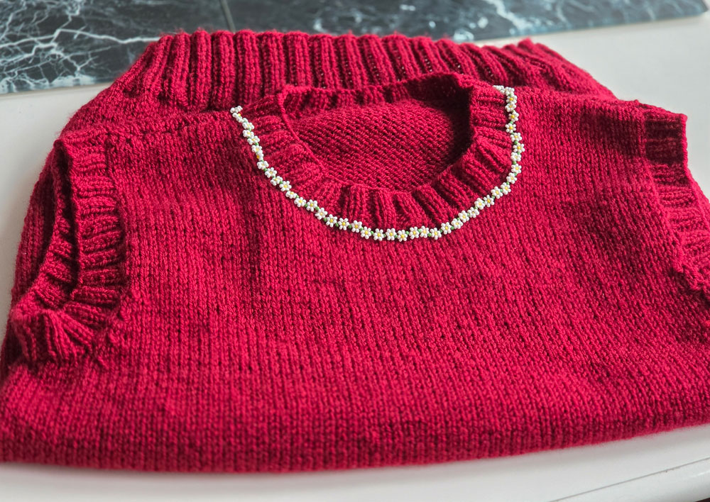 Jag stickade de på rundsticka i ett helt vanligt mönster. Det gjorde att jag bara behövde sy ihop axlarna.