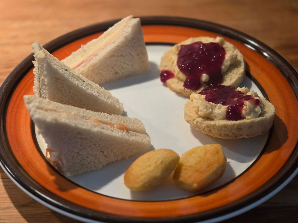 Snittar med lax, ost och skinka. Hembakta scones med egengjord hallonsylt. Och madeleinekakor efter det. Gott, gott…